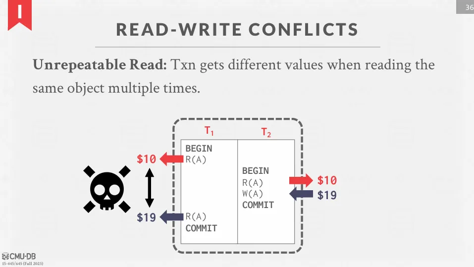 當一個交易多次讀取同一個資源但得到的結果不同時,就是 read-write conflict (unrepeatable read)。