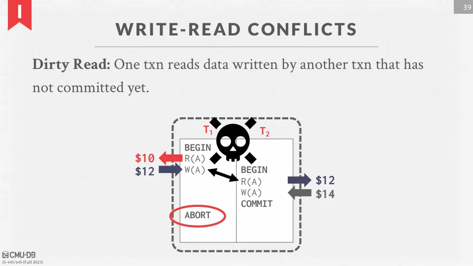 當一個交易可以讀取到另一個交易尚未提交的值時,就是 write-read conflict (dirty read)。