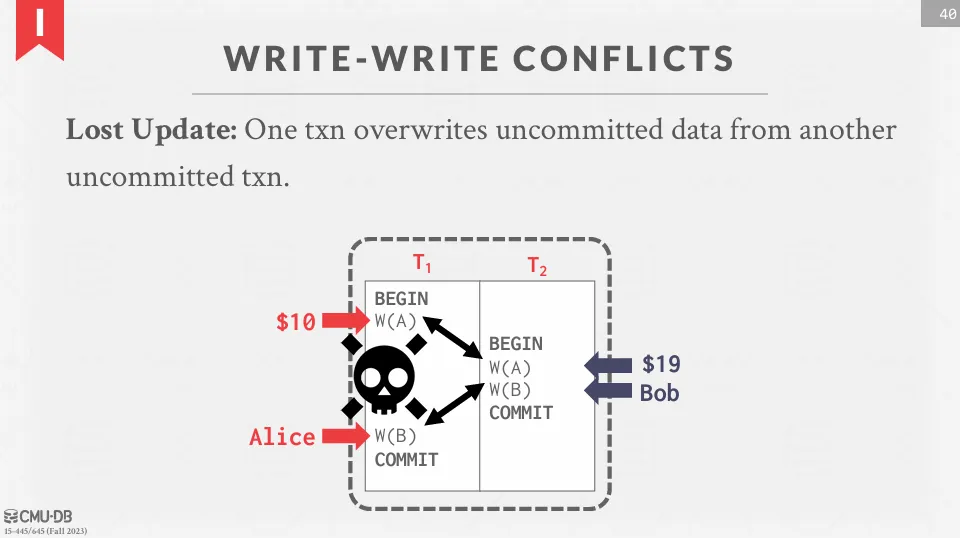 當兩個交易修改同一個資源,卻有一個交易被完全覆蓋時,就是 write-write conflict (lost update)。