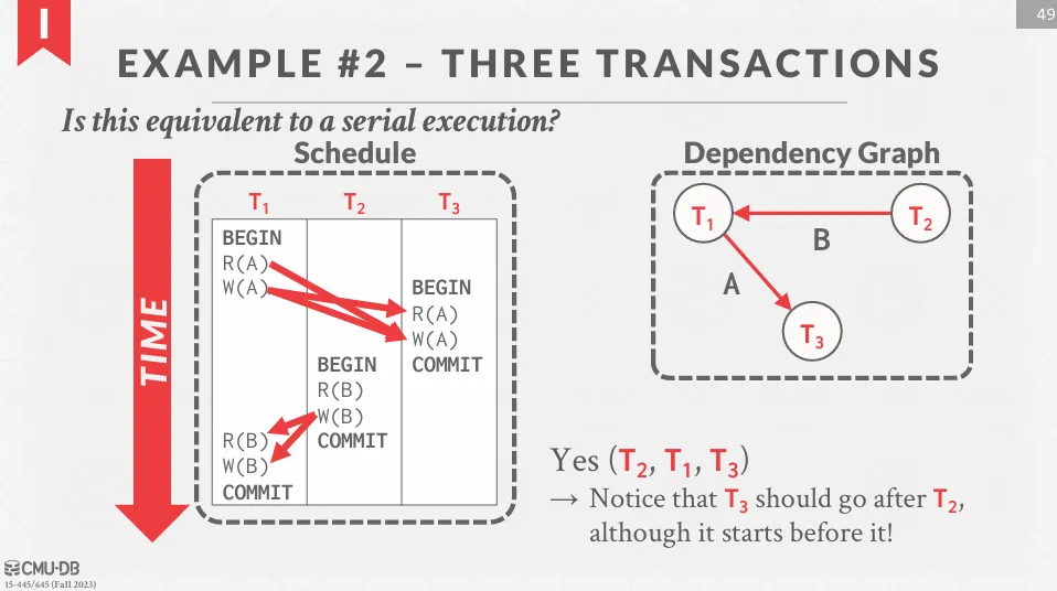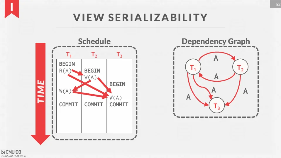 我們可以構建 dependency graph 來判斷是否是 conflict serializable。 在這個圖中,每個事務都是一個節點,如果事務 中的操作 與事務 中的操作 衝突且 在排程中先於 ,則從節點 到 有一條有向邊。 只有當這個圖是無環時,這個 scheduler 才是 conflict serializable。