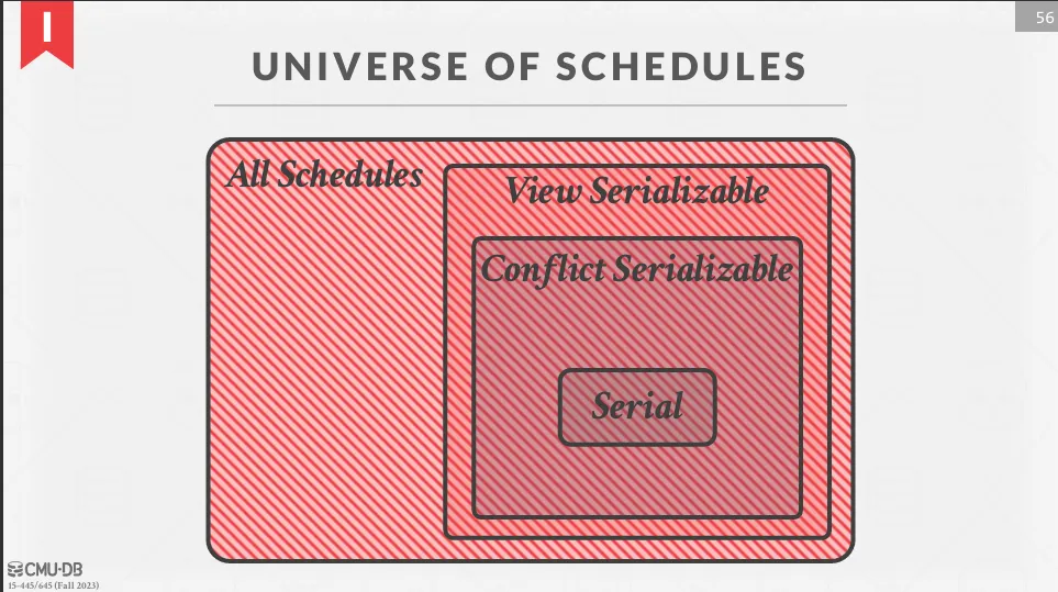 DBMS 的執行順序被稱為 execution schedule。 我們希望可以盡量交錯交易來最大程度的提高倂發性,這樣當某個交易在等待資源 (disk IO、page fault) 或 CPU 有空閒時,就可以繼續執行其他交易。