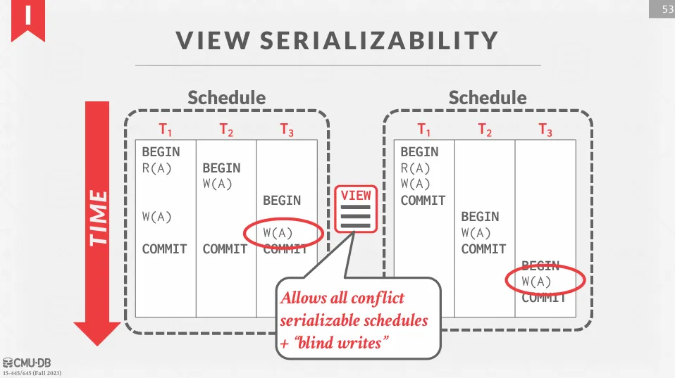 與 conflict serializability 相比,view serializability 是一種更寬鬆的標準,並允許盲寫 (blind write)。 盲寫指的是一個交易寫入一個值,但在寫之前沒有讀取過這個值。