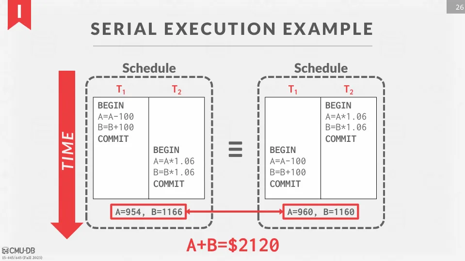 以上面的例子來說,不管是 t1 先執行還是 t2 先執行,最後的結果都應該是 元,這兩個 schedule 都是 serial schedule。