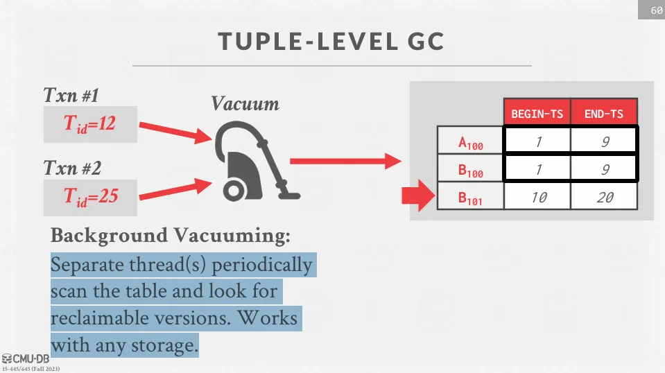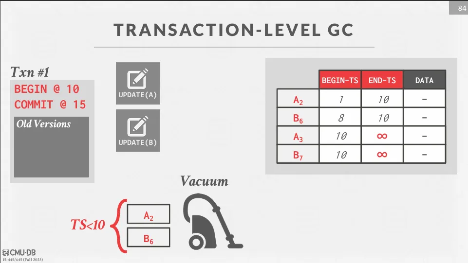 在 MVCC 中,隨著時間的推移,某些舊版本的資料變得無用。 像是一些沒有任何 active 的交易可以看到的版本,或是該交易是被一個 abort 的交易創建的,這時候就需要有一個機制來清理這些版本。