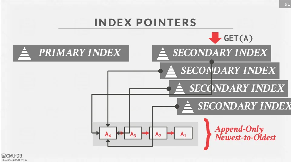 - Newest-to-Oldest (N2O) : 最新的版本在前面,最舊的版本在後面,每次插入新版本時,需要更新索引指針