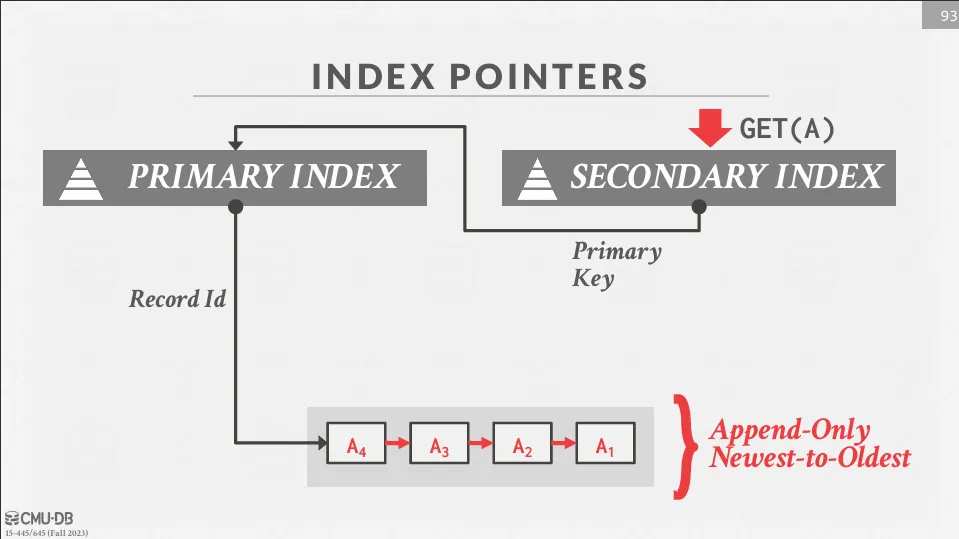 輔助索引的管理比主鍵索引更加複雜,因為這些索引需要考慮不同版本的元組如何影響索引,主要有兩種方法來管理 secondary index :