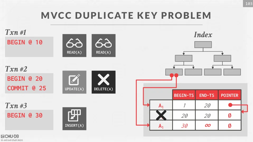 在 MVCC 索引中,通常不會儲存元組和 key 的版本資訊 (MySQL 除外),因此 MVCC 系統需要支持多個版本的相同邏輯元組。