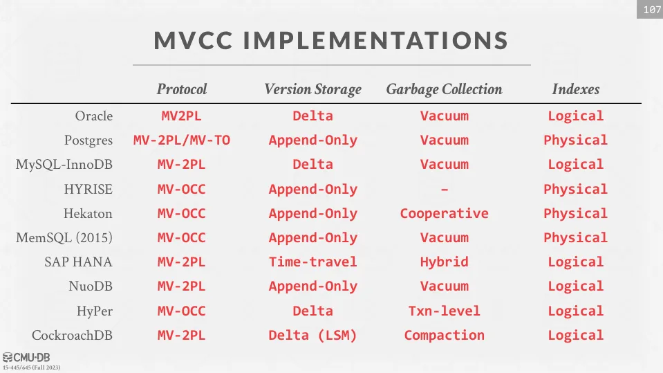 MVCC 涉及多個設計決策,這些決策會影響資料庫的性能、存儲需求以及如何處理不同的併發場景 :