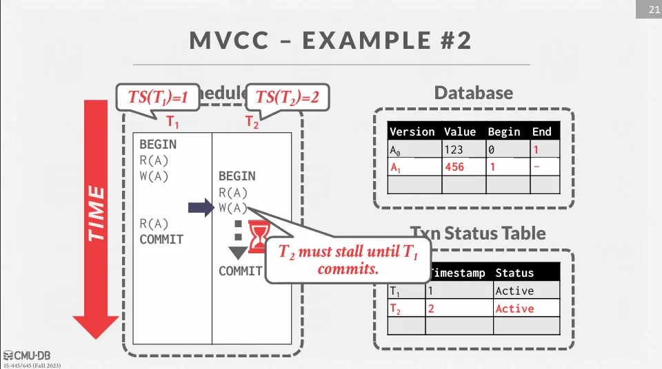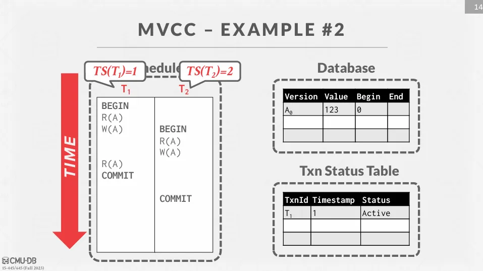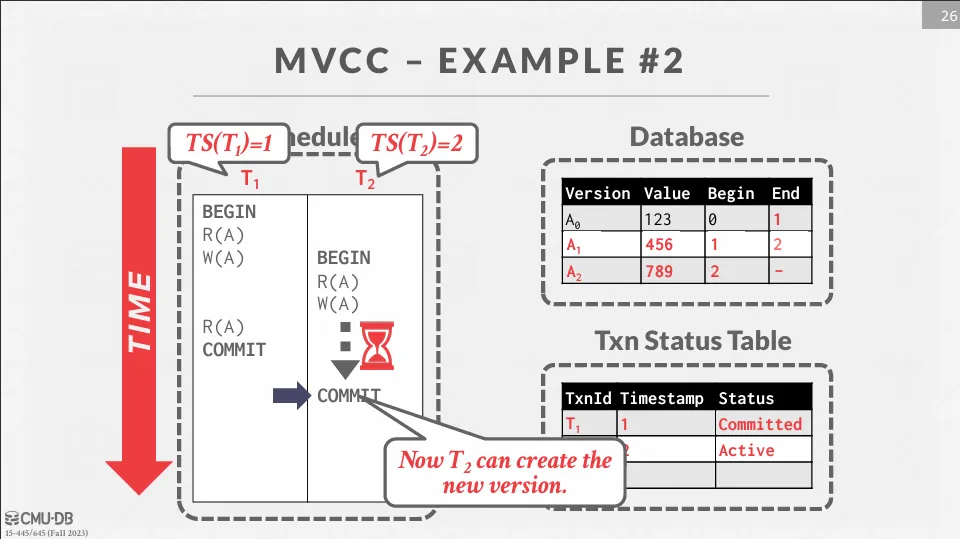 多版本併發控制 (MVCC) 是一種廣泛應用於現代 DBMS 的技術,這種技術會透過維護資料庫中每個邏輯對象的多個物理版本來實現併發控制,允許同時讀寫操作而不互相阻塞。 當交易需要讀取資料時,只會讀到該交易開始之前的最新版本。