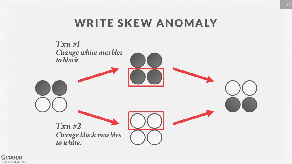 - Write Skew Anomaly : 兩個交易分別修改不同的對象,最終可能導致非可序列化的調度,如下方的圖片範例