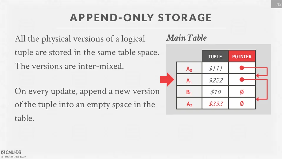 所有元組的物理版本都存儲在同一個表中。每次更新時,DBMS 會將新的元組版本附加到表中,並更新版本鏈。
