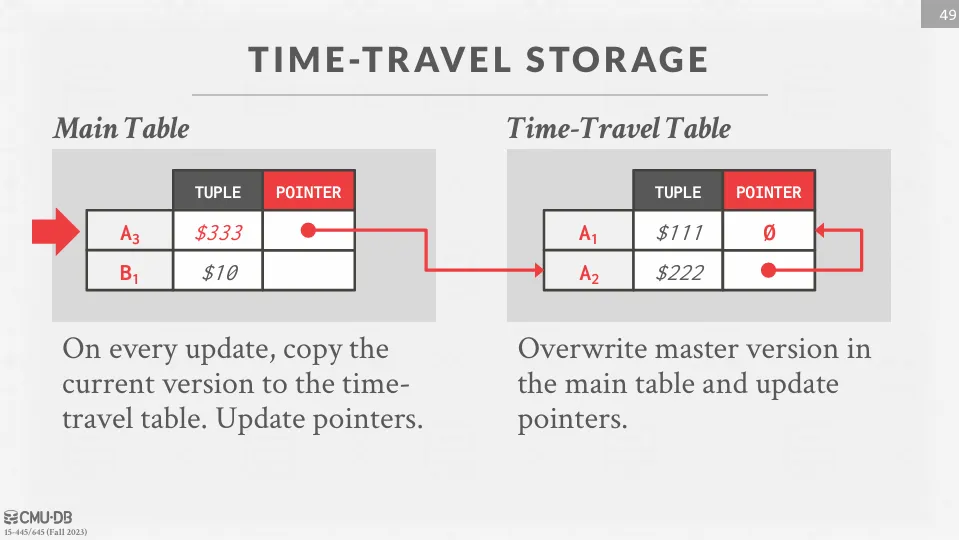 DBMS 維護一個獨立的 time travel table,用來存儲元組的舊版本。 每次更新時,DBMS 會將舊版本複製到 time travel table 中,並在主表中覆蓋元組為新版本,主表中的元組指向時間旅行表中的舊版本。
