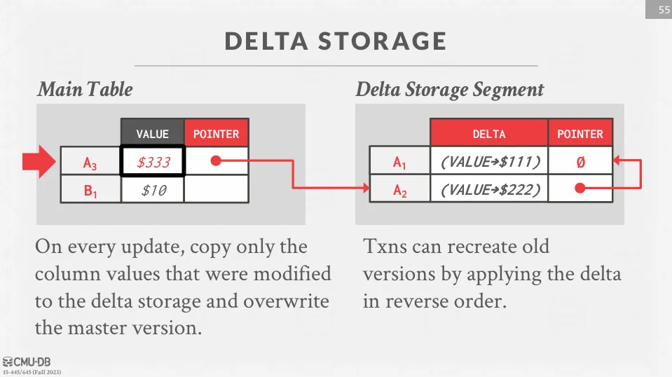 類似於 time-travel storage,但僅存儲元組之間的 Delta,而不是完整的舊版本,DBMS 可以通過逆向應用增量數據來重建舊版本。 這種方式通常比 time-travel storage 寫入更快,但查詢舊版本時會更慢。