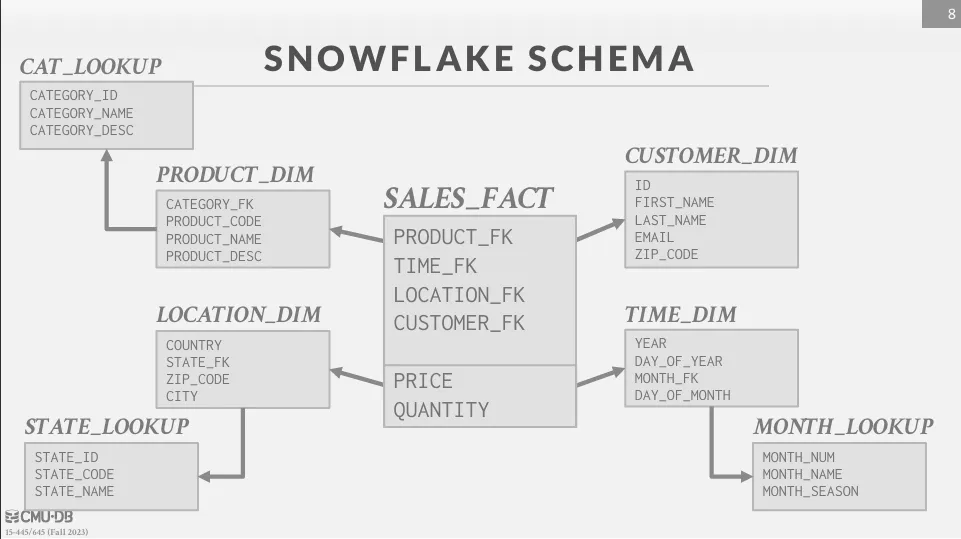 Snowflake schema 與 star schema 類似,但 dimension table 可以進一步分解成多個表,這樣可以減少重複的資料。