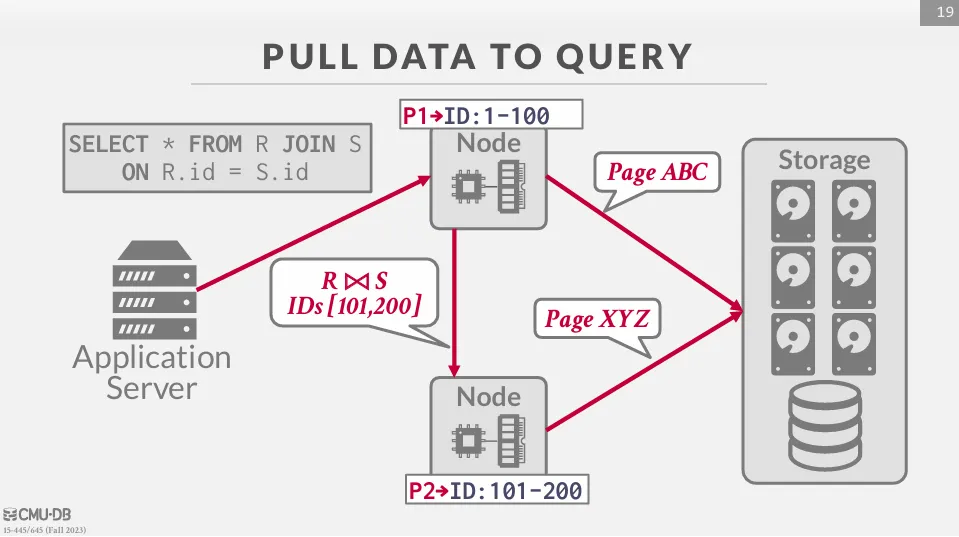 在這種方法中,DBMS 將需要處理的資料拉取到執行查詢的節點,通常是 shared-disk 的架構才會這麼做,因為所有節點都可以存取相同的資料。