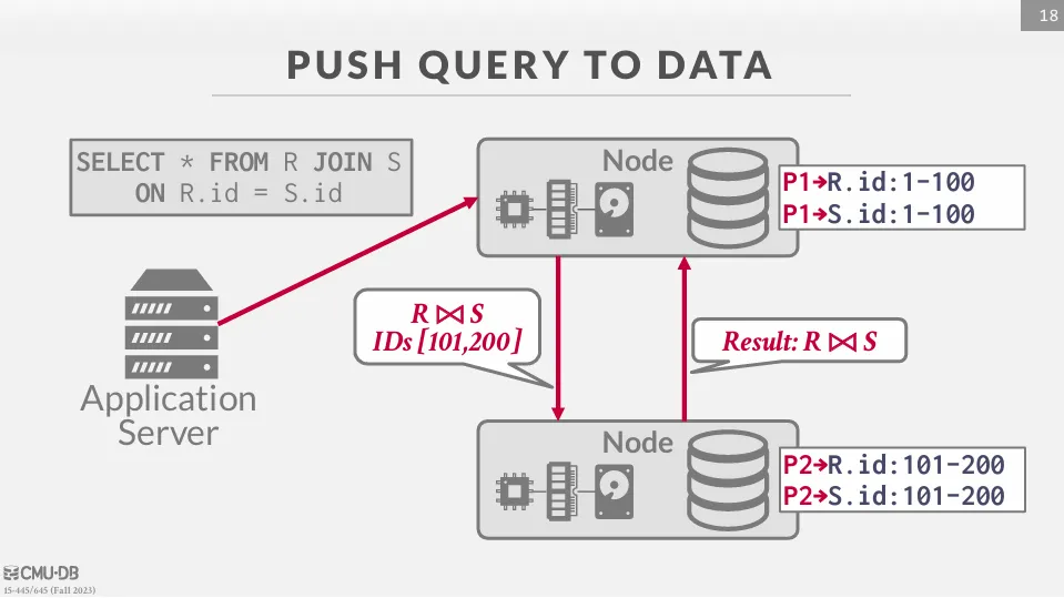 在這種方法中,DBMS 將查詢 (或部分查詢) 推送到包含所需資料的節點,並在當地執行過濾和處理,最大限度地減少網路上的數據傳輸。