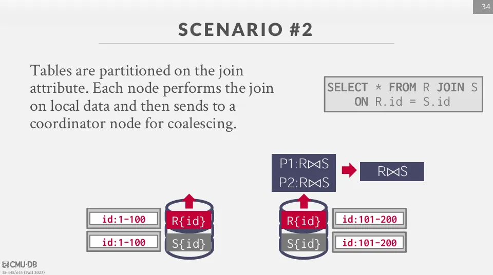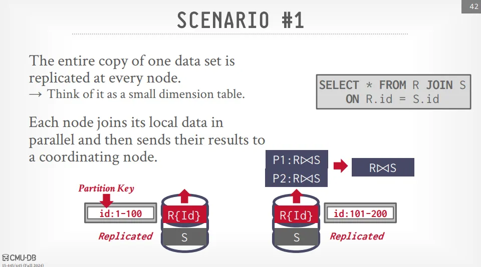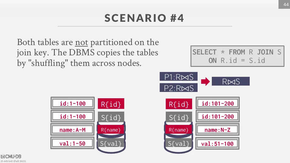 DBMS 需要重新分配這些表,將它們根據 join key 進行 shuffle,然後在本地執行聯接,最終將結果發送到 coordinating node。