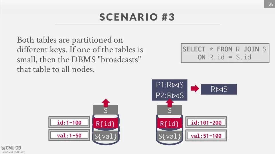 如果其中一個表較小,DBMS 可以將該表廣播到所有節點,並在本地進行 join,最終將結果發送到一個節點聚合,這種情況被稱為 Broadcast Join。
