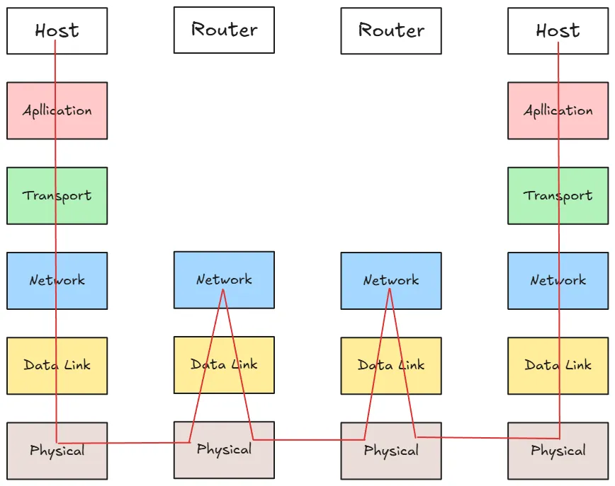 終端主機會把要傳送的資料一層一層封裝,而每個經過的路由器都會至少將其解開到網路層來獲取 IP 地址,然後再重新封裝送到下一個節點,直到目標主機為止。