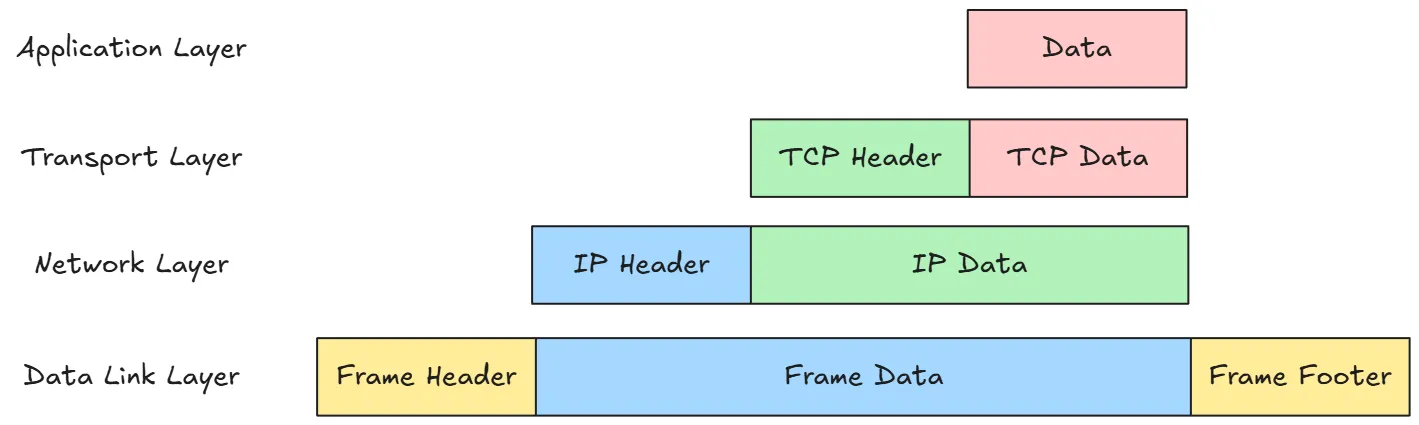 在有了分層架構之後,網路需要一種方法來讓每一層能夠理解它所接收到的資料,這就是 Header 的作用。 每一層在傳送資料時,會在資料前面加上自己的標頭,當資料到達接收端時,會依照相反的順序將標頭一層層剝除,並根據標頭中的資訊來處理資料。