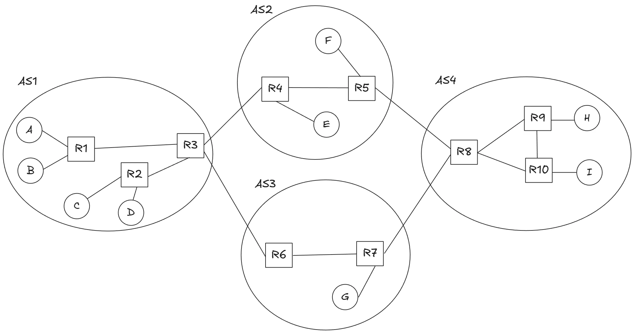 下圖是一個簡化後的網路架構,包含四個 AS,編號 A 到 I 的終端主機,以及從 R1 到 R10 的路由器,用來說明網路的轉發流程。