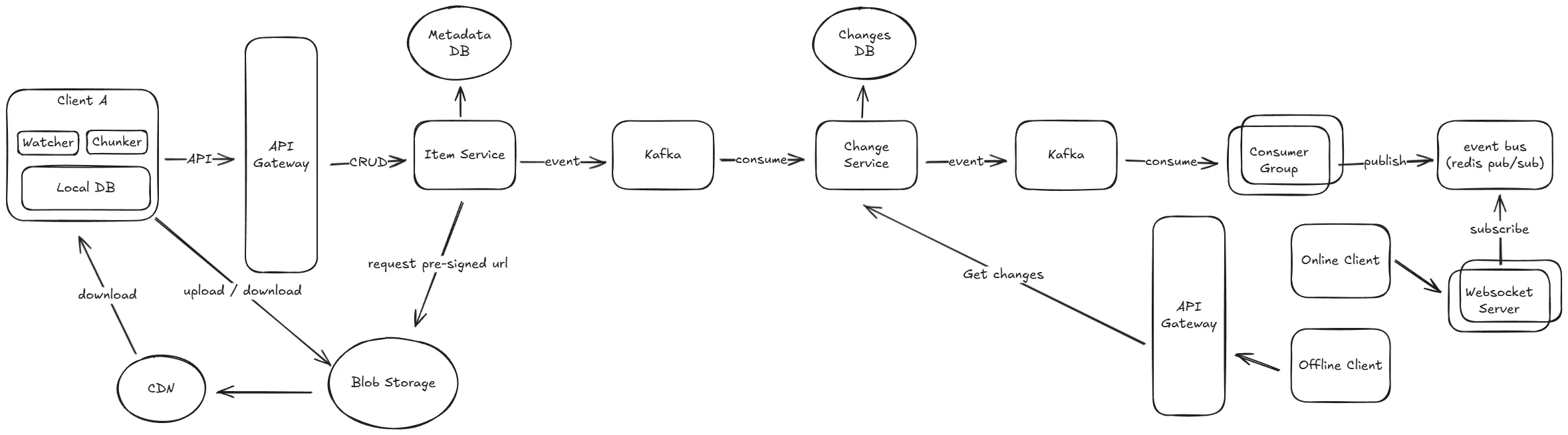 當某個檔案發生改變時,item service 會負責將變更的訊息傳送到 kafka 的一個 topic 中,這個訊息會包含有關檔案變更的詳細資訊,例如檔案 ID、版本號、變更的使用者等。 接著下游的 change service 會訂閱這個 topic,並且根據訊息中的資訊來把變更記錄到 file_changes 表中。